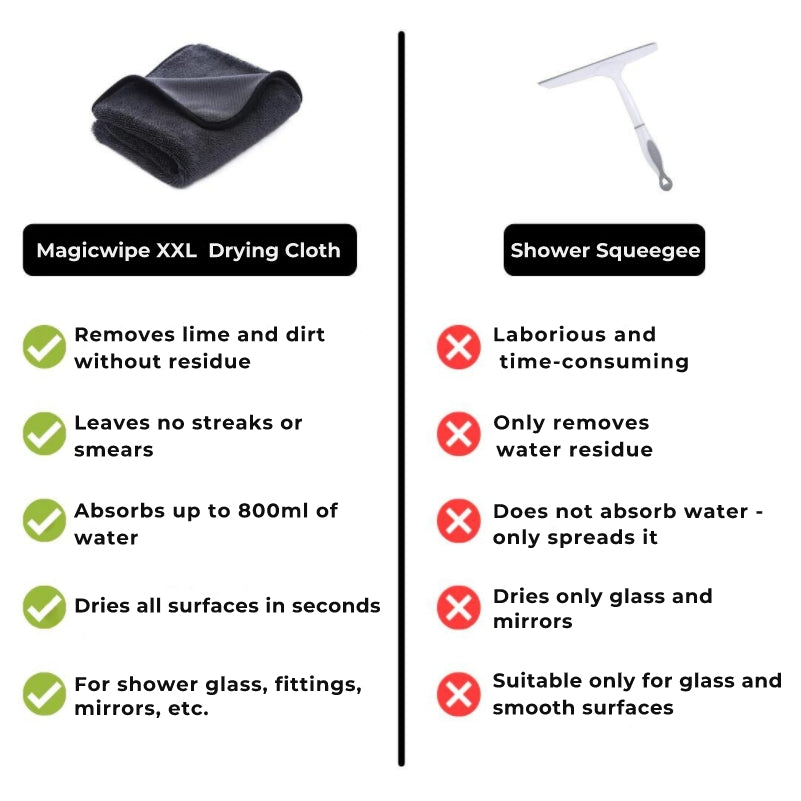Verabschieden Sie sich von der zeitaufwendigen Aufgabe, Ihre Dusche zu trocknen! Mit unserem Trockentuch gehören stundenlanges Schrubben und Wischen der Vergangenheit an. Abzieher sind jetzt überflüssig.