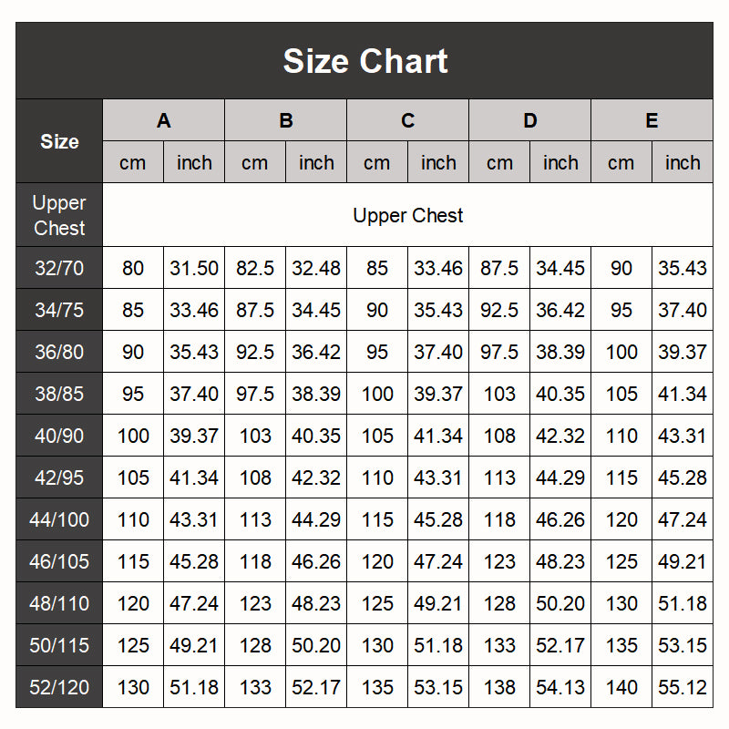 Größe: 32/70A, 32/70B, 34/75A, 34/75B, 36/80A, 36/80B, 38/85A, 38/85B, 36/80C, 38/85C, 40/90C, 42/95C