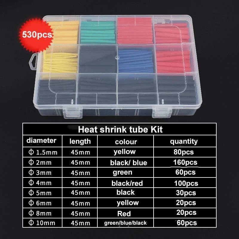 Organisierte Box: Schrumpfschläuche in 5 Farben, einschließlich schwarz, rot, blau, gelb und grün, ordentlich organisiert in einer Aufbewahrungsbox für einfachen Zugang und Transport.
